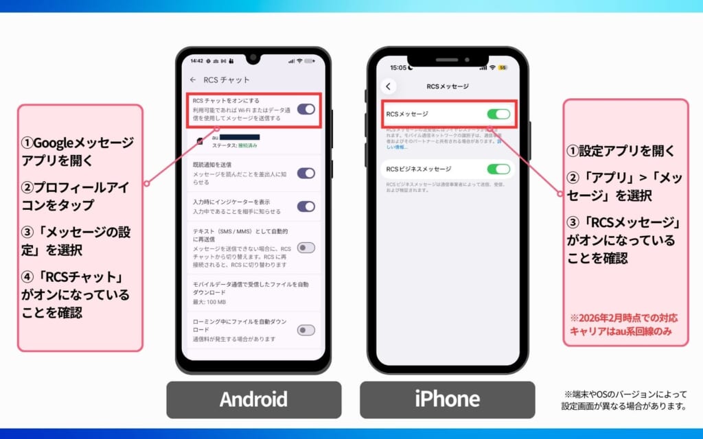 • RCS対応のメッセージアプリを使用していること(Googleメッセージ、iOSメッセージ等)