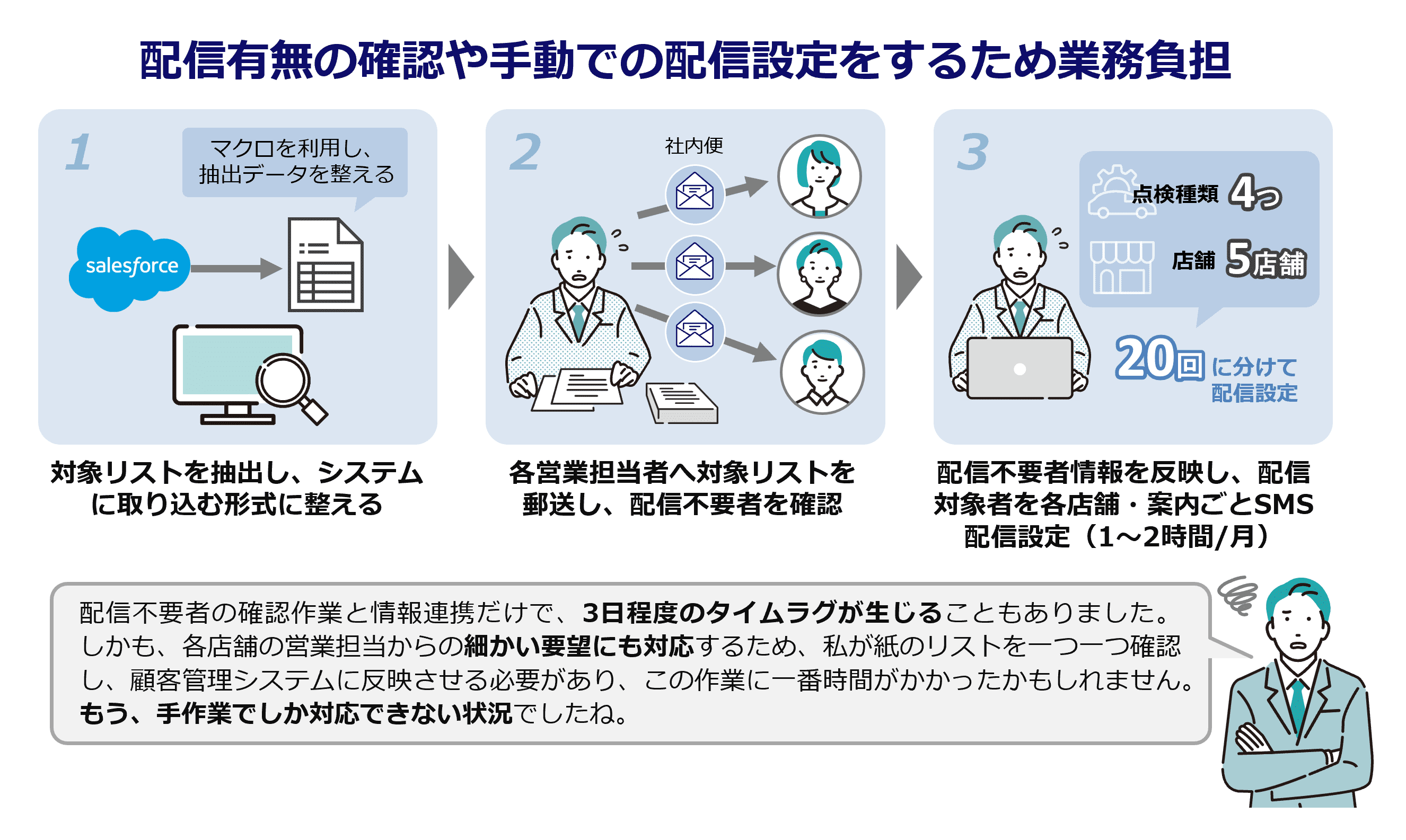 谷本 様:既存のSMSサービスは、とにかく手動での作業が多く、業務に大きな負荷がかかっていました。例えば、点検・車検案内のSMSを送信するまでに、いくつものステップを踏む必要がありました。まず、Salesforce(次期i-CROP-J)から対象データを抽出するのですが、これに約5分かかります。抽出しただけでは必要な形式ではないので、マクロを使って変換し、各店舗の点検対象者に割り当てる作業も必要でした。さらに大変だったのは、一括でデータをアップロードできなかったことです。点検の種類が4種類、店舗が5店舗(時にはそれ以上)あると、合計で20回ものアップロードを個々に行う必要があり、慣れても約20分、途中で電話などが入るとさらに時間がかかりましたね。