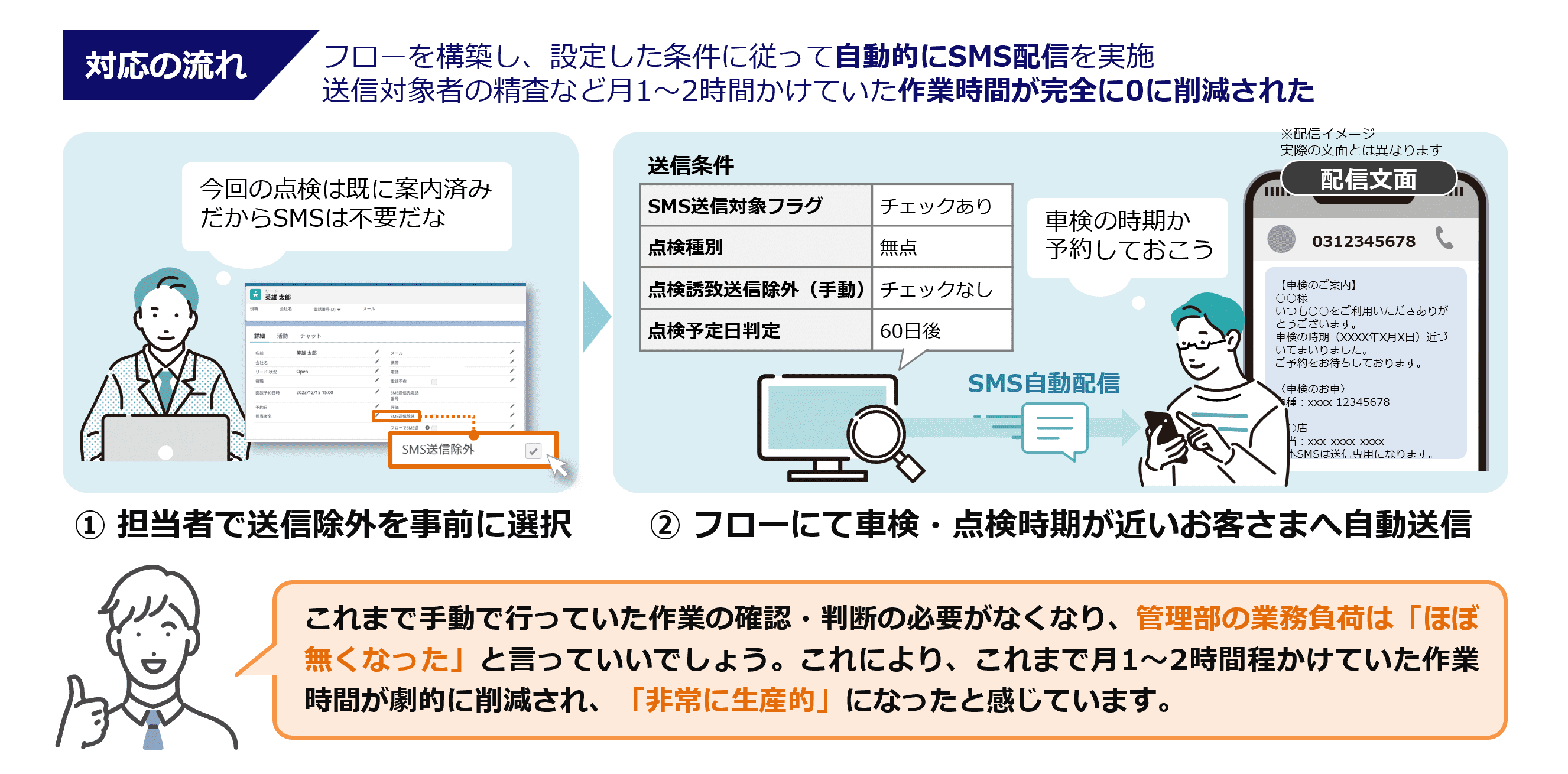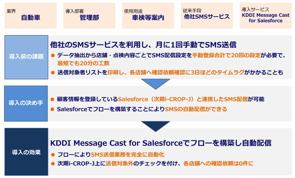 - これまで手動で行っていたSMS送信業務を自動化し、車検・点検案内における顧客フォローの最適化を実現