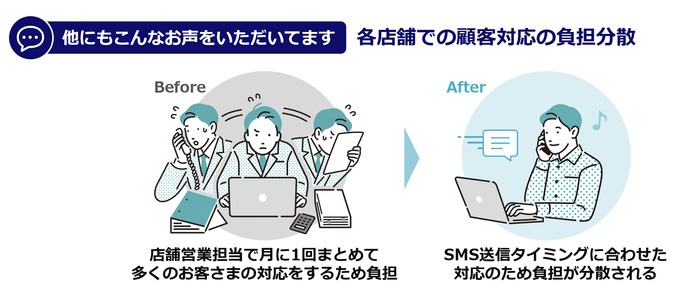 谷本 様:はい、大きな変化がありました。 KMC for SF は送信日が明確になるため、営業担当者がSMS送信のタイミングに合わせて、お客様に電話フォローを入れることが容易になりました。以前は月に1回の送信で、一度に多くのお客様に対応しなければならず、担当者の負担が大きかったのですが、今はその負担が分散され、より効率的な顧客対応が可能になっています。