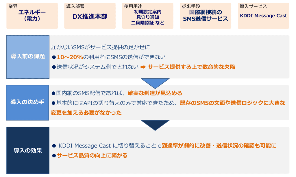 - 国際網接続のSMS送信サービスから、国内直収接続で“信頼度の高さと安定した到達率”を誇る「KDDI Message Cast」に切り替え