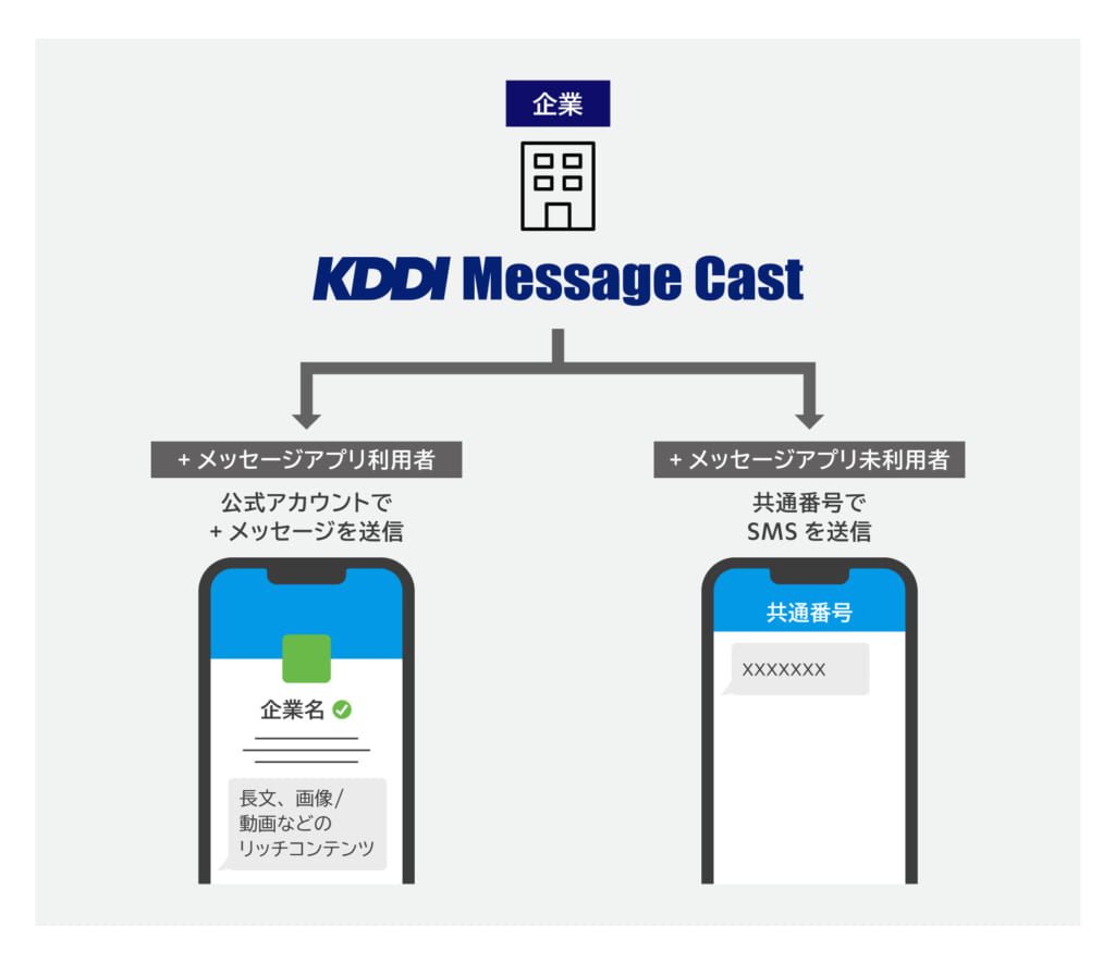本パッケージでは、共通番号からのSMS送信に加え、「+メッセージ(プラスメッセージ)」(https://biz.kddi.com/service/message-cast/#message)(注3)との組み合わせにより、お客さまにメッセージをさらに安心して受信・開封いただけるオプションを追加することも可能です。