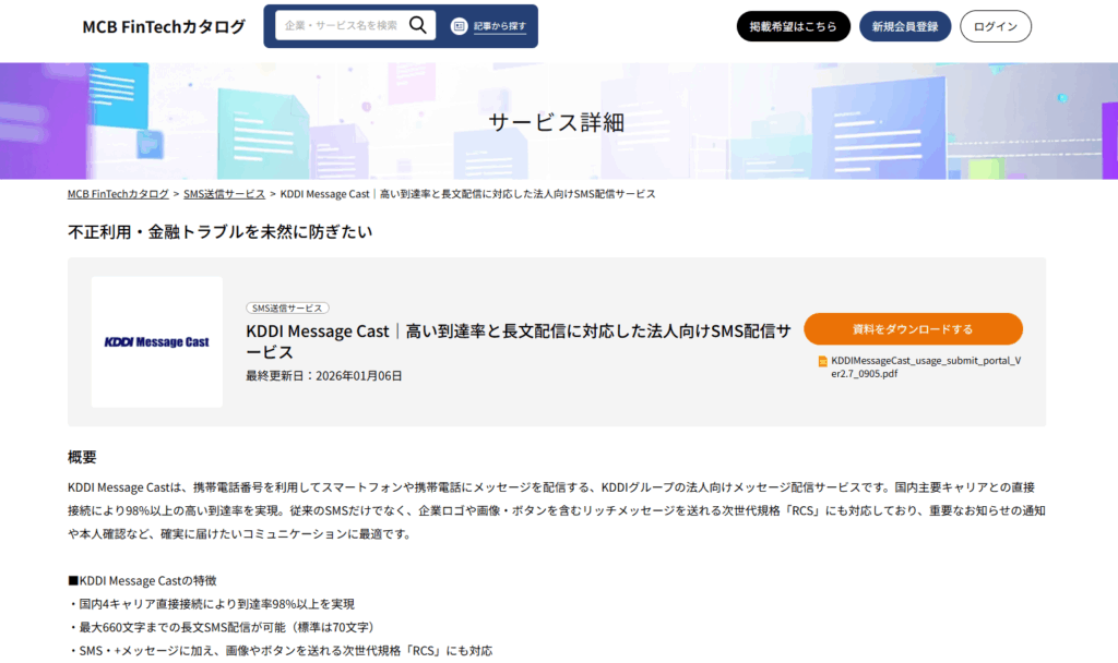 SMS・RCS送信サービス「KDDI Message Cast」が、金融領域の法人向けサービスを課題別に比較・検討できる資料請求サイト“MCB FinTechカタログ”に掲載されました。
