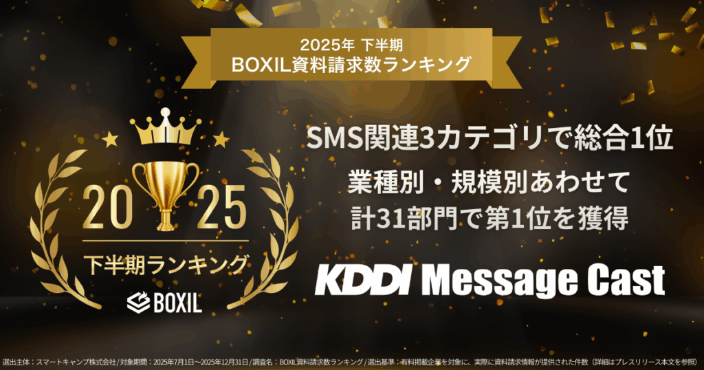 KDDI Message Cast、「2025年下半期 BOXIL資料請求数ランキング」にて SMS関連3カテゴリで総合1位を獲得、従業員規模・業種別の計31部門でも1位