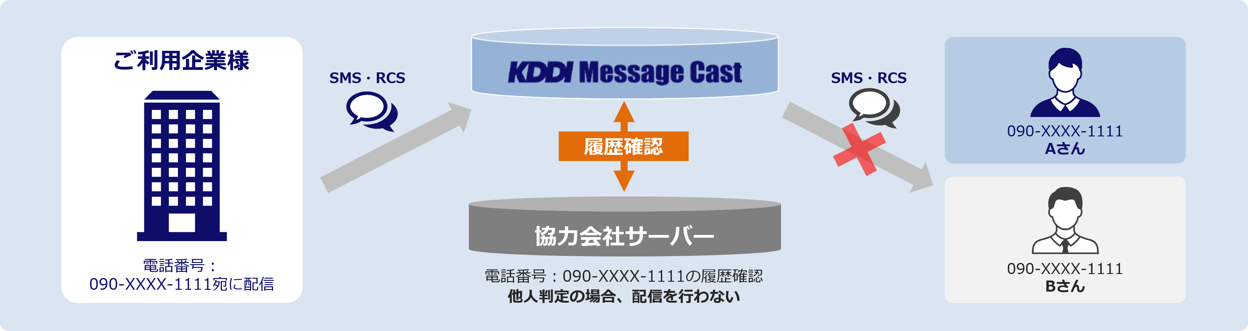 配信先ユーザーの電話番号を、他人が利用している可能性を事前に確認し、異なるユーザーへのメッセージ配信を防止する機能です。配信先の電話番号の履歴から他人が利用している可能性を判定し、他人判定があった場合はメッセージ配信を行いません。